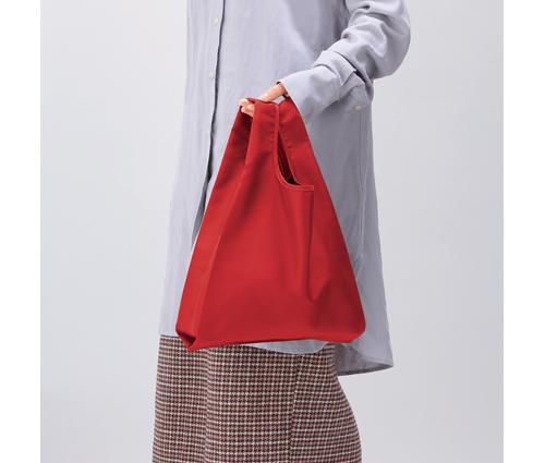 スペンザ・ソフト再生PETコンビニサイズエコバッグ レッドは、再生PETでできたポリエステル生地を使用した、環境に優しい小さめサイズのエコバッグです。