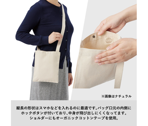 間口はボタンで閉める仕様で、オーガニックコットンを使用したキャンバス地だから丈夫で扱いやすく、肌なじみの良さも特長です。