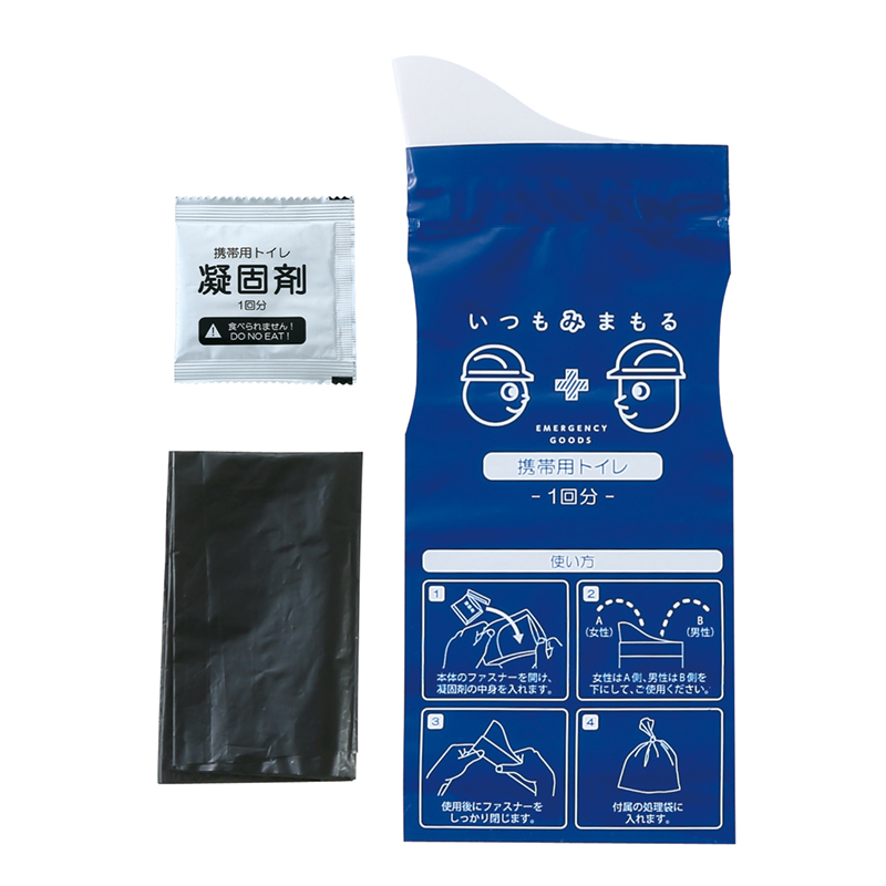約400×320mmの持出しバッグに防災グッズ20点が入っています。グッズ全てがホワイトとブルーで統一されたシンプルデザインも特徴。