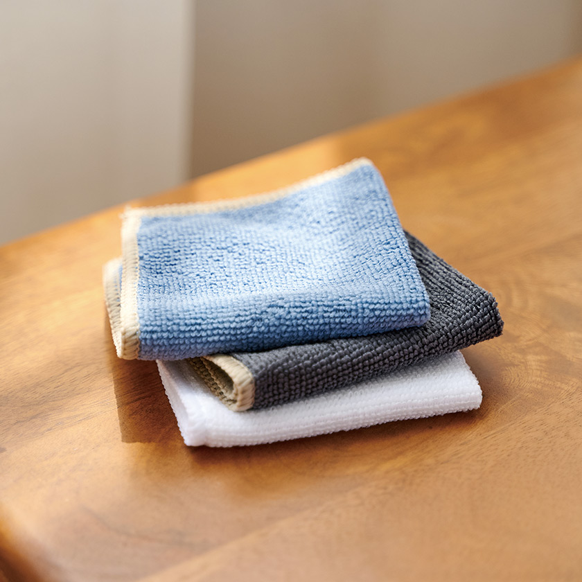ホワイト・グレー・ブルーと色違いのクロスの3枚セットです。クロスは吸水性の集塵力が高く、水拭きにも乾拭きにも対応する使い勝手の良い仕様です。