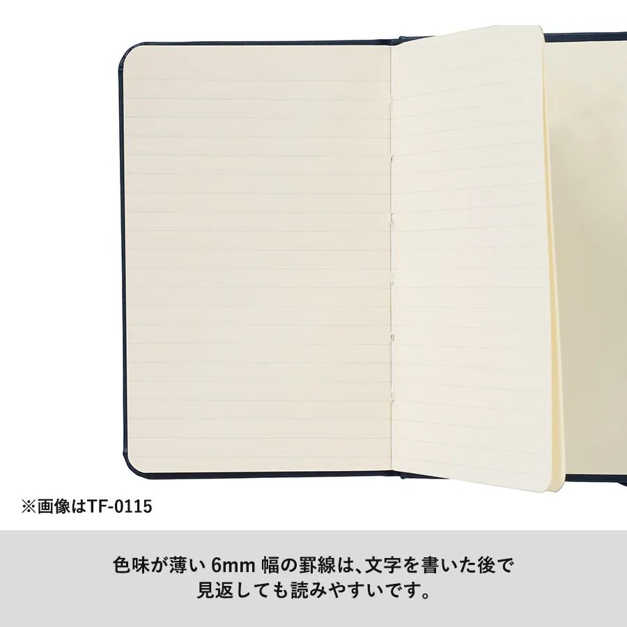 ブラックのハードカバーハンディノートは、はがきよりひと回り小さくて持ち運びやすいサイズのハードカバーノートです。ハードカバーにはPU素材を使用、本革製品のような高級感ある仕上がり。ノート部分には6mm幅の罫線が入っていますが、一般的なノートの罫線と比べると薄い色味です。バッグ内などでノートが開いてしまわないようゴムバンドが付いているので、持ち運びやすいでしょう。