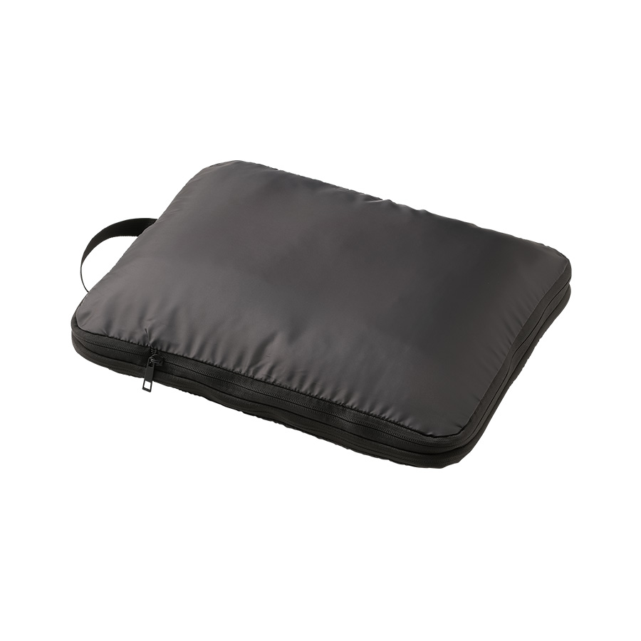 圧縮ポーチ(M) ブラックは、本体の空気を抜いてコンパクトに持ち運べる便利なポーチです。2ヶ所に付いたファスナーから空気を抜き、ファスナーを閉めることでポーチ自体が圧縮されます。