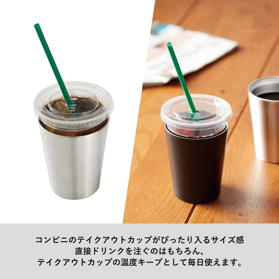 ステンレスサーモタンブラー360ml ゴールドは、飲み口の広いマットな質感のステンレスタンブラーです。真空二層構造でコンビニのコーヒーカップが入る大きさなので、カップホルダーとして使っても飲み物の温度を保ってくれます。