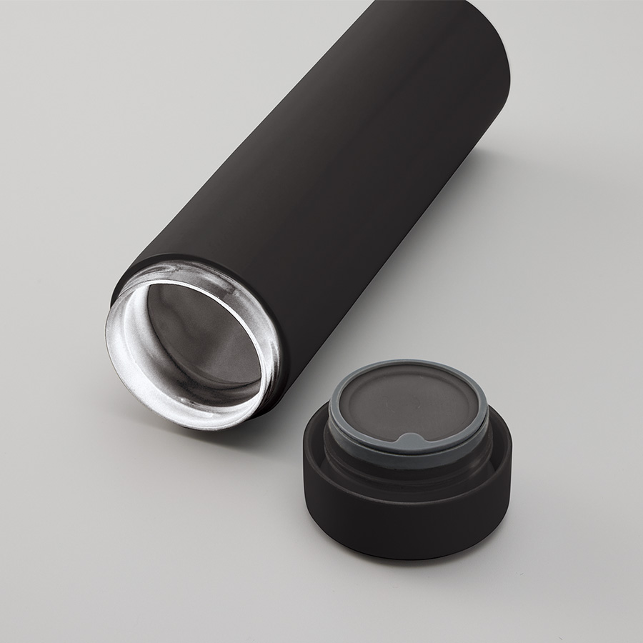 ステンレスサーモドリンクボトル 430ml ブラックは、とてもシンプルなデザインで持ちやすいストレート型のステンレスボトルです。薄手のステンレスを採用したことで軽量化されており、ボトル内側は保温・保冷力の高い銅メッキ加工。